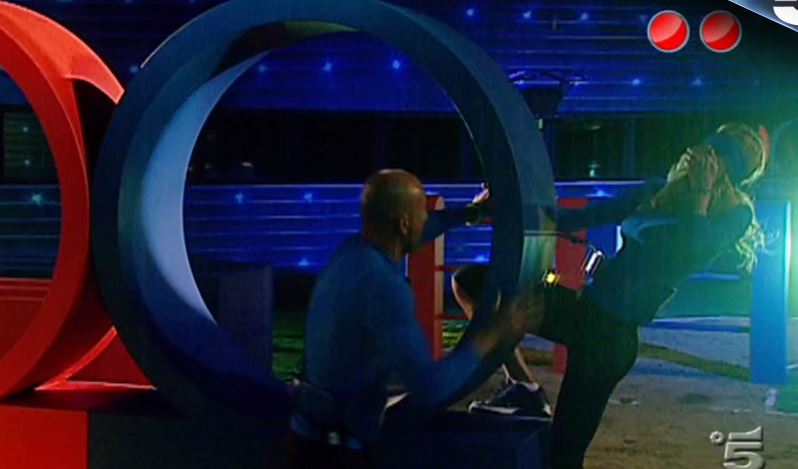 00.04: Parte la gara tra le due squadre! Elenoire si fa male e sbatte contro uno degli ostacoli. Fortunatamente niente di grave per lei. Vince la squadra rossa!