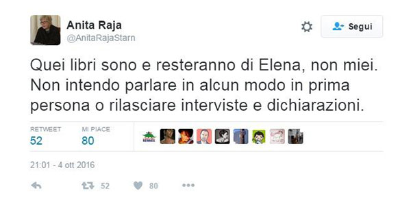 Dalla casa editrice E/O arriva una smentita, e confermano che il profilo era un fake. Hanno riferito infatti di aver “parlato con Anita Raja la quale ha detto di non aver aperto alcun account”.