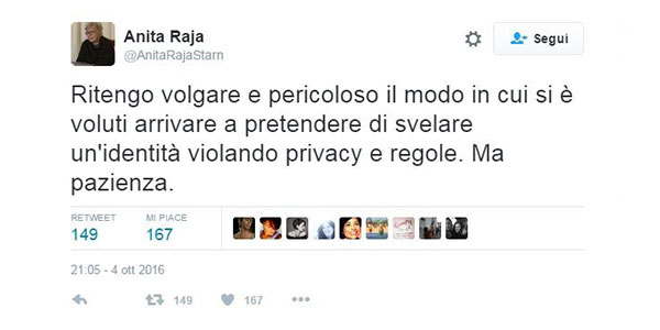 “Lo confermo sono Elena Ferrante“, così recita un tweet dell’account – adesso rimosso – @AnitaRajaStarn (Starn sarebbe un’abbreviazione del cognome del marito, lo scrittore Domenico Starnone) che è stato aperto ieri notte dicendo di voler spiegare e fare chiarezza dopo le numerose polemiche successive all’inchiesta per scoprire l’identità della scrittrice.