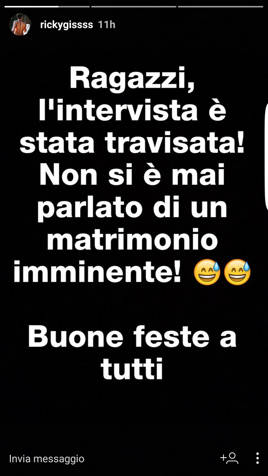 Riccardo quindi ha smentito i rumors che erano circolati in rete usando Instagram, o meglio usando una storia di Instragram in cui ha scritto: “Ragazzi l’intervista è stata travisata. Non si è mai parlato di un matrimonio imminente”.