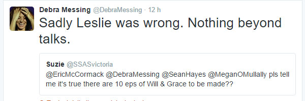 Ma a smorzare l’entusiamo dei fan ci ha pensato Debra Messing su Twitter: “Purtroppo Leslie si è sbagliato. Niente al di là di colloqui”.
