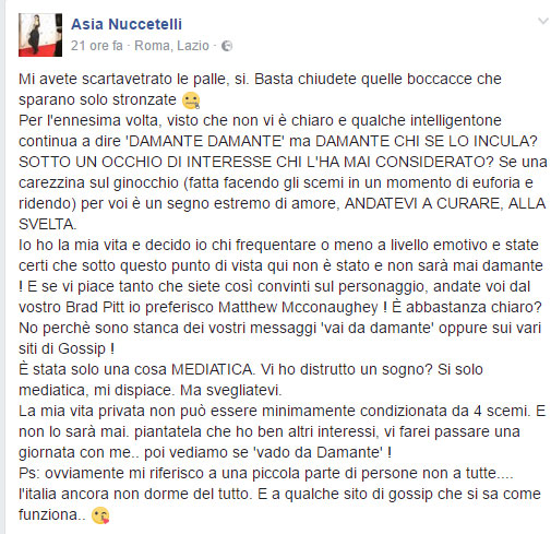 Si sfoga Asia Nuccetelli su Facebook, esattamente come farebbe qualsiasi ragazza della sua età. Si sfoga perché (giustamente) non ne può più di essere insultata o comunque provocato sui social network ancora e ancora per quello che è successo nella Casa del Grande Fratello Vip e poi fuori con l’ex tronista Andrea Damante.