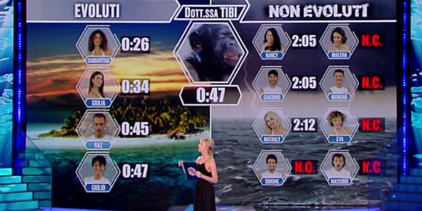 23.23 – Prova evolutiva della settimana: chi dei naufraghi sarà “evoluto”? L’ago della bilancia anche per questa puntata è la dottoressa Tibi. Ad essere evoluti sono soltanto Samantha De Grenet, Giulio Base, Raz Degan e Giulia Calcaterra.