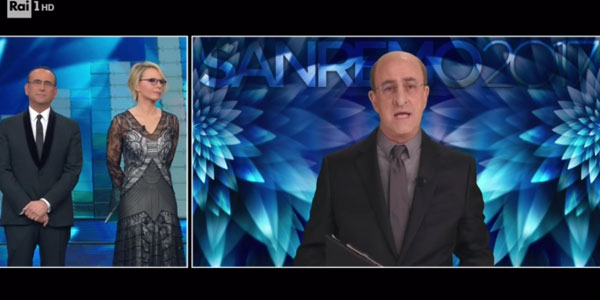 22.02 – Collegamento con Maurizio Crozza che si collega con l’Ariston nelle vesti di Nando Pagnoncelli, il sondaggista italiano. Il comico chiude dicendo: “Siete bellissimi insieme. Fate venire voglia di pagare il canone. A Mediaset però…”.