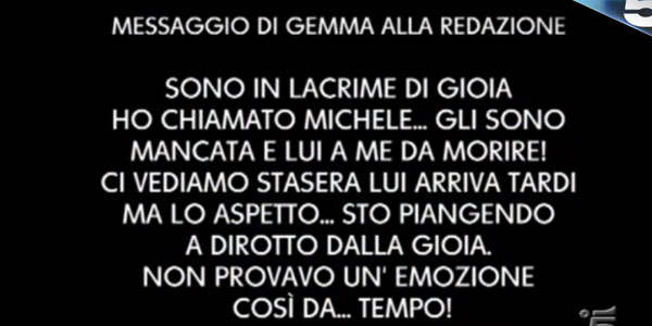 15.26 – “Ieri sera con Gemma è stata una serata molto piacevole”, dice Michele. “Gli ho detto che ho notato maggiore complicità con Cristina e non con me…”, dice Gemma. “Questi discorsi non mi interessano”, dice Cristina decidendo di alzarsi e di andarsi a sedere nel parterre.