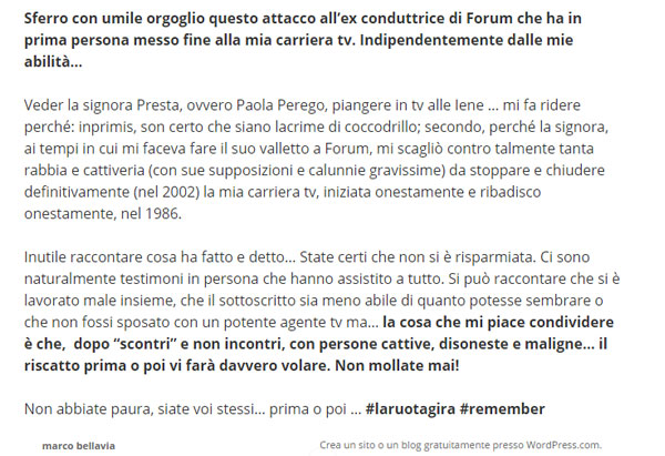 Veder la signora Presta, ovvero Paola Perego, piangere in tv alle Iene … mi fa ridere perché: inprimis, son certo che siano lacrime di coccodrillo; secondo, perché la signora, ai tempi in cui mi faceva fare il suo valletto a Forum, mi scagliò contro talmente tanta rabbia e cattiveria (con sue supposizioni e calunnie gravissime) da stoppare e chiudere definitivamente (nel 2002) la mia carriera tv, iniziata onestamente e ribadisco onestamente, nel 1986.
