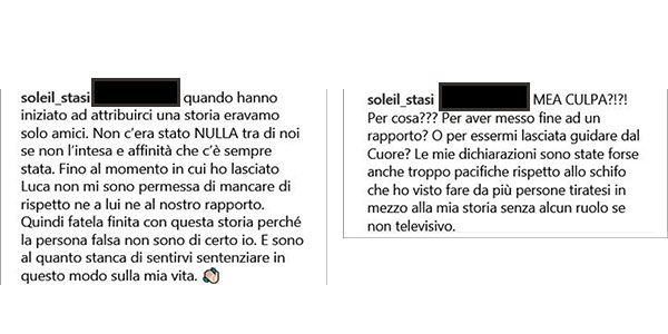 Soleil continua a dire che non ha tradito Luca e ha fatto un passo in più con Marco solo dopo che la loro storia era finita.