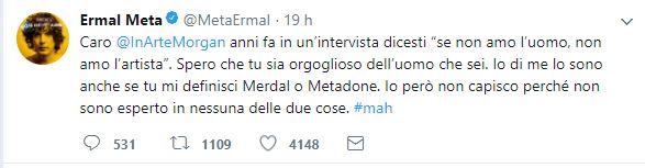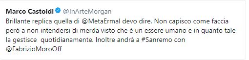“Fabrizio Moro! Cioè il Sanremo di Baglioni lo vince Fabrizio Moro, che poi sta con Ermal Merdal. Cioè Meta, come Metadone“. Le parole di Morgan, ospite del “Barone Rosso”, formato condotto da Red Ronnie, sono tutte per Ermal Meta che insieme a Fabrizio Moro forma una delle coppie favorite per Sanremo 2018. Una previsione che non va proprio a genio a Marco Castoldi, in arte Morgan. Le sue parole hanno scatenato l’ira di Ermal Meta, che ha risposto così sui social.