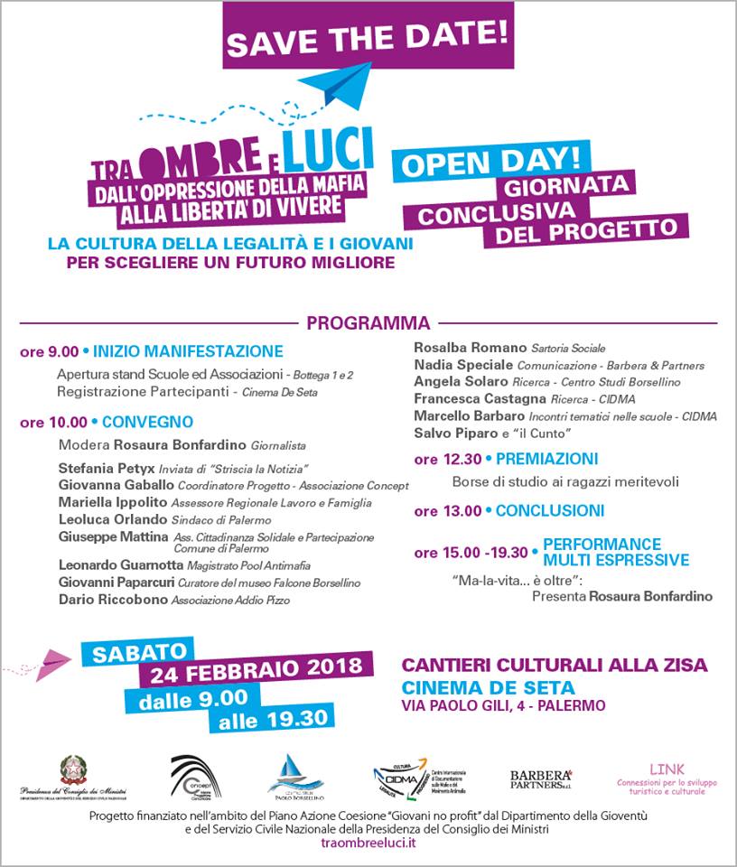 PALERMO. Un impegno lungo un anno che giunge al gran finale tra riflessioni, proiezioni, spettacoli e premiazioni. Prende vita sabato 24 febbraio dalle 9 alle 19.30 al Cinema De Seta, all’interno dei Cantieri Culturali alla Zisa, la giornata conclusiva del progetto “Tra ombre e luci. Dall’oppressione della mafia alla libertà di vivere”.