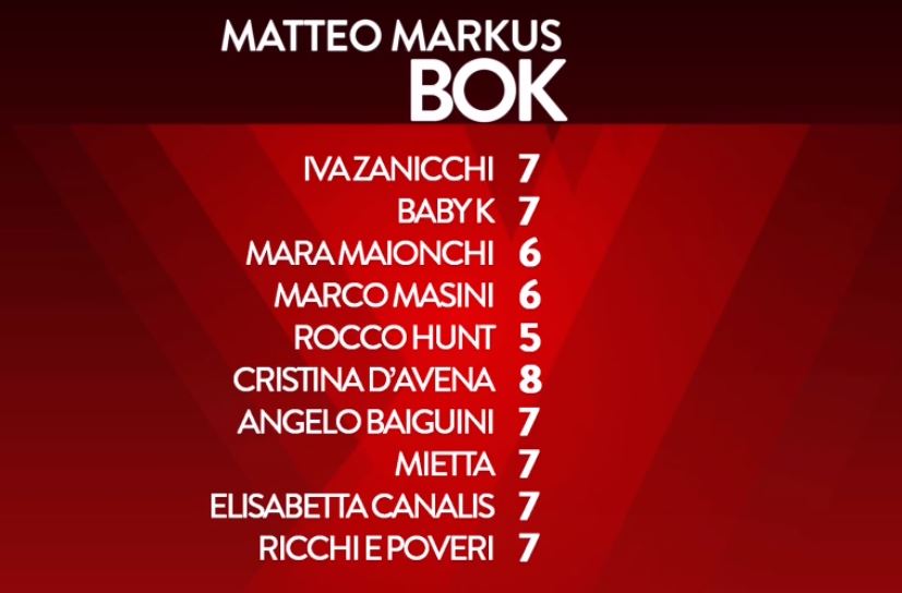 Grande delusione per Matteo Markus Bok, l’idolo delle teenagers di Sanremo Young che si è esibito con “Se Telefonando” di Mina. Molti 6 e 7 per la sua esibizione da parte dei giurati, che non l’hanno apprezzato come la scorsa volta.