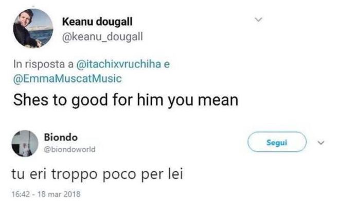 Pare infatti che Emma abbia lasciato il fidanzato per avvicinarsi al compagno di scuola. I più attenti del mondo del web hanno notato uno scambio di tweet tra l’ex di Emma e Biondo: “She’s too good for him” (“Lei è troppo per lui”), ha scritto Keanu, “Tu eri troppo poco per lei”, ha ribattuto Biondo.