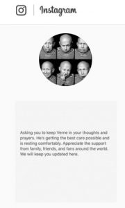 In un messaggio pubblicato sul profilo Instagram dell’attore si legge: “Verne sta ricevendo le migliori cure possibili e apprezza il sostegno di familiari, amici e fan in tutto il mondo”. Sembra che quello dell’attore sia stato un tentativo di suicidio e in ospedale è stata compiuta una perizia psichiatrica.