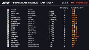 Il “folle” volo di Vettel ha dunque spiazzato i due piloti della Mercedes. Bottas, secondo, stacca il tedesco di quasi 7 decimi. Hamilton, penalizzato e partito in nona posizione, si è reso protagonista di una fenomenale rimonta, piantonando Valterri e raggiungendo un ottimo terzo posto. Chiusa la pole, Gasly è quarto, davanti a Magnussen che precede la Renault di Hulkenberg, arrivata al traguardo in sesta posizione.