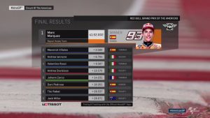Valentino si difende con un buon quarto posto. Non rischia mai di farsi agganciare dagli inseguitori. Ma al podio non riesce neppure ad avvicinarsi. Maverick è troppo veloce. Così, Rossi precede un grande Dovi che, nonostante i sorpassi, oggi non ci ha fatto sognare. Grazie alla caduta del leader di classifica, Cal Crutchlow, Andrea Dovizioso torna in testa alla classifica iridata. Un solo punto di vantaggio lo separa dal re del Texas.