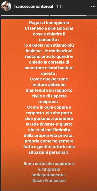 Intanto Monte ha pubblicato una storia su Instagram annunciando la fine della storia con la showgirl. “Ci tenevo a dire una cosa e chiarire un concetto. Io e Paola non stiamo più insieme, le motivazioni restatno private”.