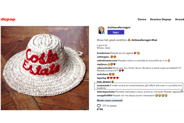 Sul suo profilo si trovano scarpe, borse e molti accessori. Alcuni utenti non si sono lasciati scappare un particolare commento postato sulla pagina nella quale Chiara Ferragni ha messo in vendita un cappello: “È triste lucrare sui complimentary gift offerti alla crew in una delle loro trasferte”, si legge e il nome utente è proprio “costaestate”, come la scritta del cappello.