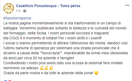 “La nostra pagina momentaneamente si sta trasformando in un campo di battaglia – scrivono sulla pagina social del Caseificio Passalacqua -. Vorremmo pubblicare soltanto le bellezze e le curiosità del mondo del formaggio, della Sicilia, i nostri personali successi e traguardi. Ma OGGI è il momento di lottare! Per i nostri diritti e i vostri!! I social ci stanno permettendo di attirare l’attenzione dei media, dandoci così l’ultimo barlume di speranza per sistemare una strada provinciale che è, diciamo a causa della “burocrazia”, impraticabile da ormai mesi (dissestata da anni) per circa 50 tra aziende e famiglie! Condividendo i nostri post avete dato una scossa al sistema! Non mollate nemmeno voi adesso. Grazie da parte nostra e da tutte le aziende della zona!”.