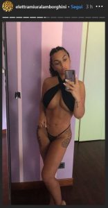 Elettra è davanti allo specchio in posa per un selfie, con indosso un costume da bagno che lascia poco all’immaginazione. Il reggiseno, a fascia, è intrecciato dietro al collo e lascia intravedere il suo seno prosperoso e lo slip è talmente piccolo che sembra non riuscire a coprire ciò che dovrebbe. Un bikini davvero audace, che è perfettamente in linea con il carattere della cantante. Capelli raccolti e senza un filo di trucco, la Lamborghini è davvero stupenda.