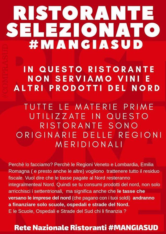 L’iniziativa sta spopolando nelle strade e sul web con un notevole afflusso di adesioni.”In questo locale non serviamo vini, prosecchi e spumanti prodotti in Veneto – recita la locandina affissa sulle vetrine – Qui si servono solo prodotti del sud“. Meglio essere chiari sin da subito, d’altra parte uomo avvisato…