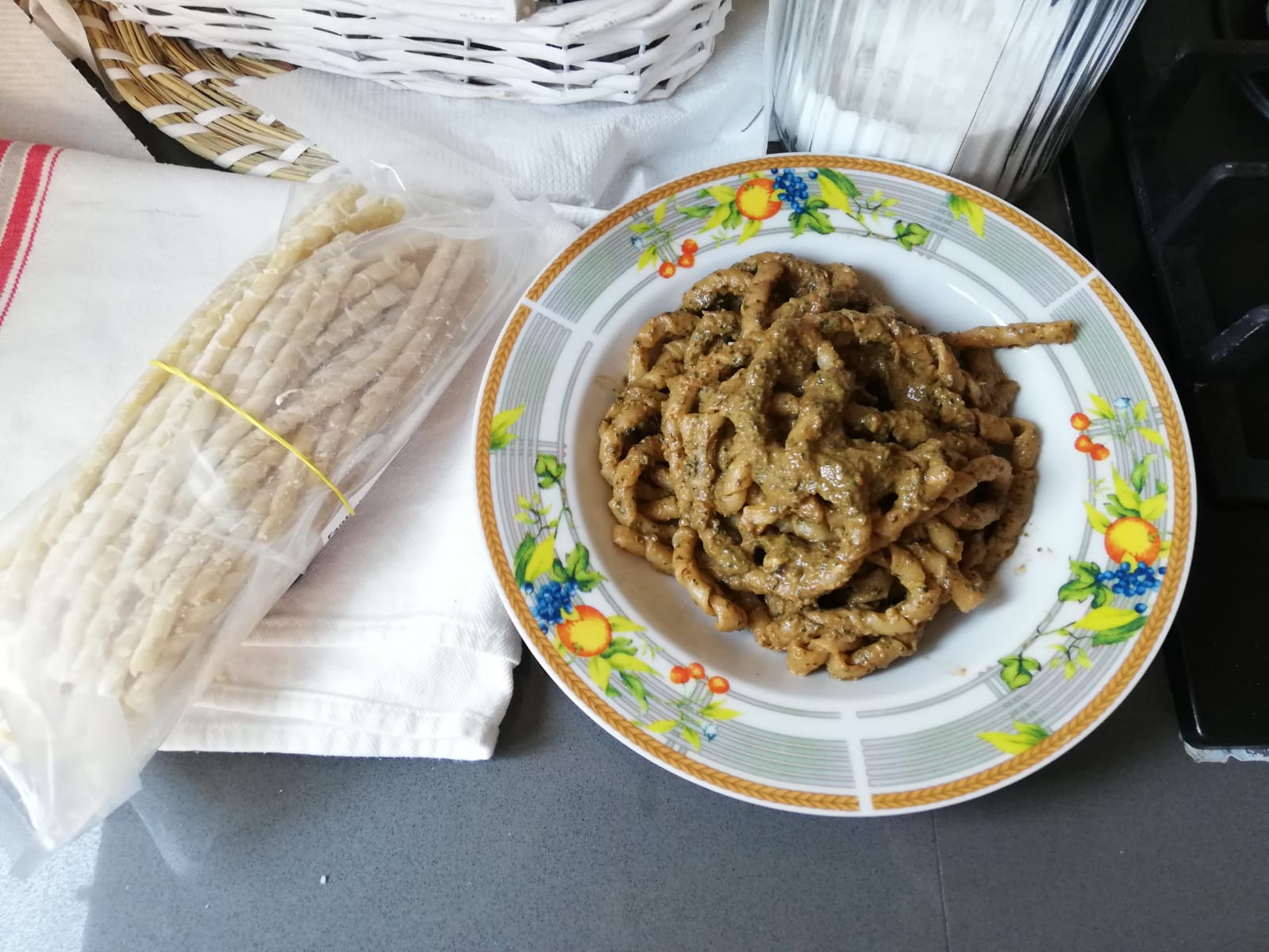 Il caso ha voluto che mi regalassero – giorni fortunati quelli – anche una confezione di busiate di pasta fresca direttamente da Calatafimi, in provincia di Trapani. La forma attorcigliata di questa pasta, la sua callosità e la porosità dell’impasto erano esattamente ciò che ci voleva per il mio pesto.