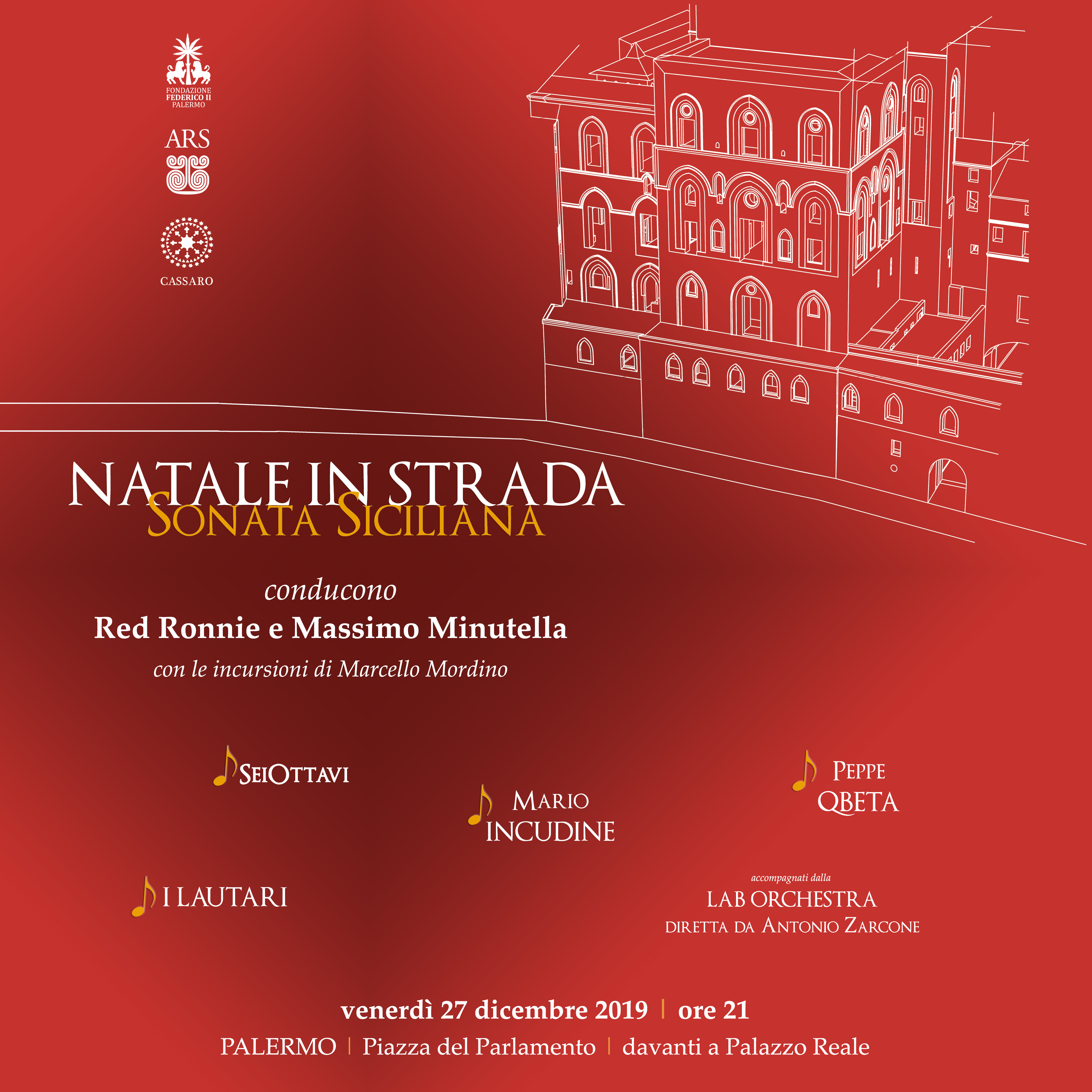 Una sonata siciliana in Piazza del Parlamento, nel cuore del Cassaro di Palermo. “Natale in strada. Sonata siciliana”, organizzato dalla Fondazione Federico II e dall’Assemblea Regionale Siciliana, con il coinvolgimento dell’Associazione Alto Cassaro, è stata condotta da Red Ronnie e Massimo Minutella. Sul palco Mario Incudine, i Seiottavi, Peppe Qbeta e i Lautari.