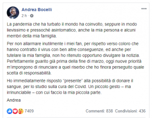 Andrea Bocelli ha contratto il coronavirus e adesso è guarito. “La pandemia che ha turbato il mondo ha coinvolto, seppure in modo lievissimo e pressochè asintomatico – scrive su facebook – anche la mia persona e alcuni membri della mia famiglia”.