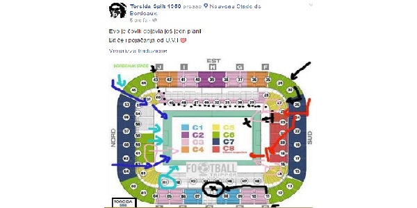 Nel profilo del gruppo ultrà di Spalato viene pubblicata una foto dello stadio di Bordeaux dove si giocherà Croazia-Spagna, con delle frecce sui settori dell'impianto da dove potrebbero essere lanciati in campo petardi