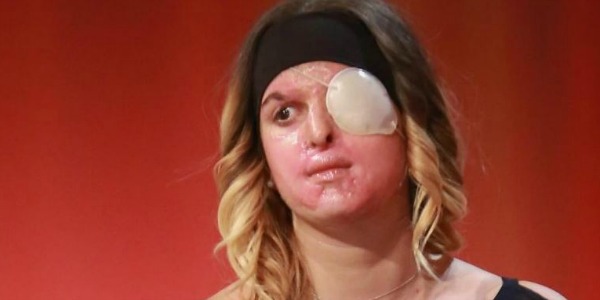 L'ex finalista di Miss Italia, invitata da Maurizio Costanzo, si è presentata in studio con un paio di jeans, una camicia nera, un paio di tacchi e un foulard sul viso che ha poi fatto scivolare via per mostrare a tutti il suo volto