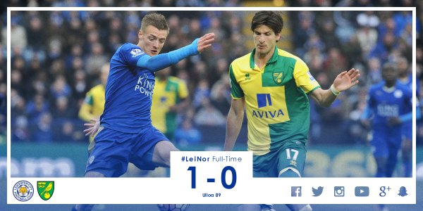 Leonardo Ulloa, su assist di Vardy, trova all'89esimo la rete del successo e rafforza il primo posto in classifica con 56 punti. L'Arsenal perde 3 a 2, il Tottenham fatica contro lo Swansea di Guidolin.