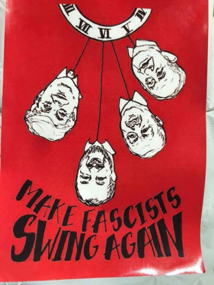 Su pali e muri sono comparsi adesivi con l'immagine di Matteo Salvini impiccato a testa in giù. Con lui anche i volti di Netanyahu, Erdogan e Trump