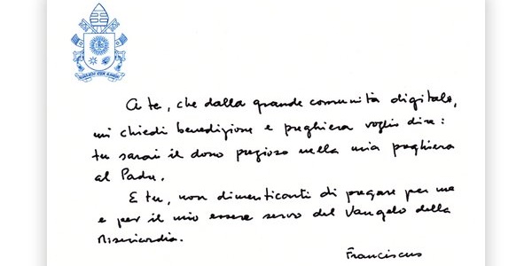 "A te, che dalla grande comunità digitale, mi chiedi benedizione e preghiera voglio dire: tu sarai il dono prezioso nella mia preghiera al Padre" scrive sul suo profilo ufficiale di Instagram e Twitter