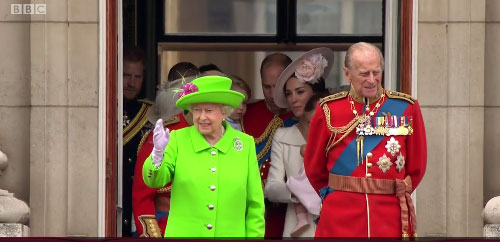 Al gran completo la famiglia reale che ha salutato la folla dal balcone di Buckingham Palace: e la Regina, con la sua mise, si faceva notare particolarmente