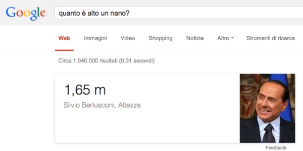 Non è ancora chiaro se sia un errore del motore di ricerca o gli algoritmi abbiano voluto dare un risultato “sincero”, ma se si cercano su Google le parole chiavi “quanto è alto un nano?”, il primo risultato mostrato è Silvio Berlusconi