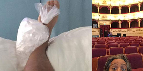 Subito ha postato su Twitter una foto con il ghiaccio sulla caviglia ma ha rassicurato tutti i suoi fan: lo spettacolo si farà. E così è andata, della serie: "The show must go on!"