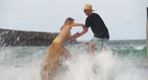 Coperta solo da un velo dorato, la modella è stata letteralmente travolta da un'onda sulla spiaggia di Aruba