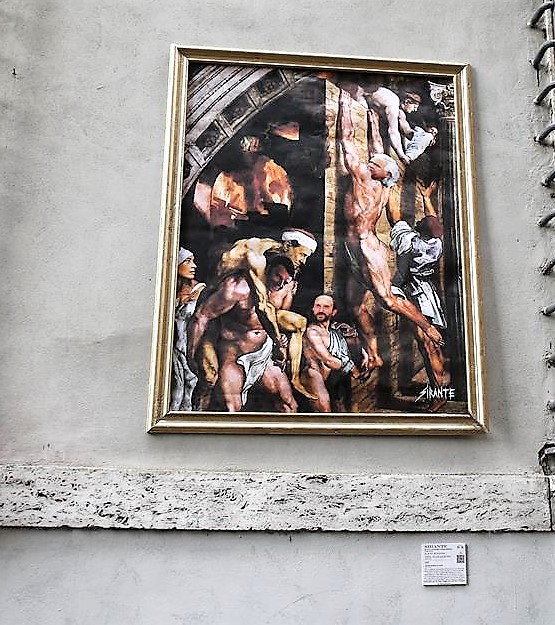 Nei pressi della sede del Partito Democratico, nel giorno in cui si riunisce la direzione, l'artista Sirante ha esposto l'opera dal titolo "L'incendio del Nazareno"