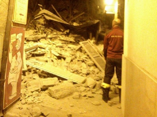 Il crollo è avvenuto intorno alle 5 in corso Pierluigi. Sul posto vigili del fuoco e carabinieri. Al momento non risultano feriti