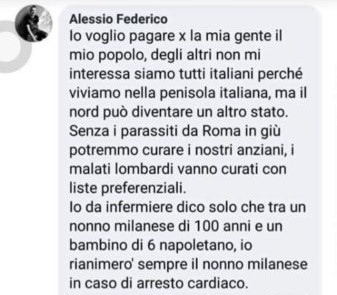 Si tratta di un post di un infermiere milanese; il messaggio è stato subito rimosso insieme al profilo dell'utente ma la polemica è già scattata