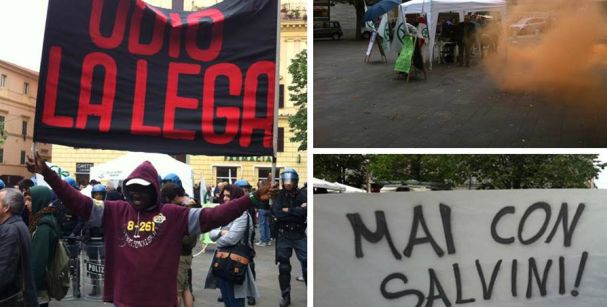 Un gruppo di manifestanti dei centri sociali ha provato a aggredire il leader della Lega nord, Salvini, nelle Marche per la campagna elettorale