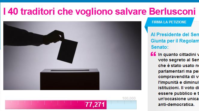 Alcuni manifestanti, vestiti solo di cartelli e della biancheria intima, hanno consegnato poco più di 70mila firme al presidente della giunta, Dario Stefano. Oggi alle 15 la giunta per il regolamento deciderà in merito proprio al voto palese delle Camere, chiamate a pronunciarsi sulla permanenza in Senato di Silvio Berlusconi.