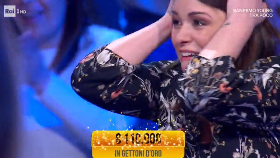 Lacrime di gioia per la ragazza che, incredula per la vincita, ha abbracciato Amadeus