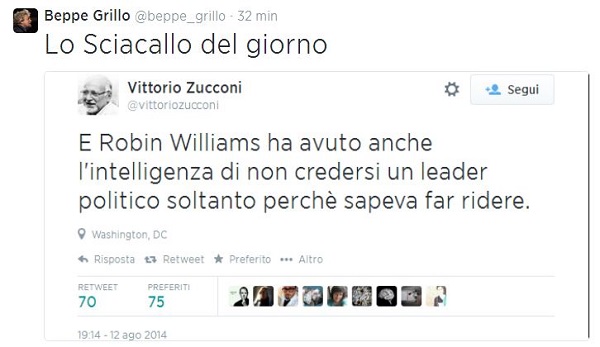 Il direttore dell'edizione online di Repubblica ha twittato: "Robin Williams ha avuto l'intelligenza di non credersi un leader politico" pur essendo un comico. E l'ira di Grillo e del Movimento 5 Stelle non si è fatta attendere