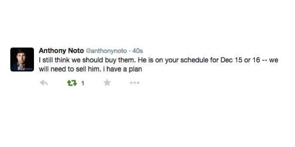 Un tweet privato che per errore diventa pubblico: è successo ad Anthony Noto, chief financial officer di Twitter, che in un cinguettìo pubblicato sulla sua timeline piuttosto che inviato come messaggio privato, parla di dover acquistare probabilmente un’azienda