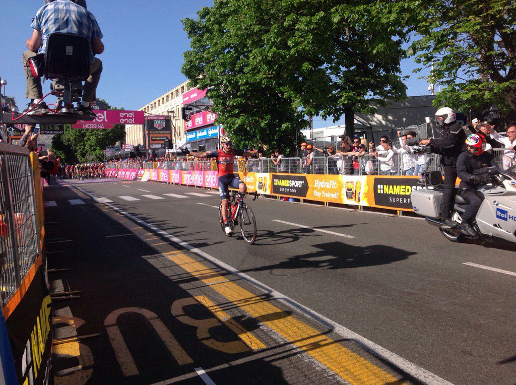 Pibernik esulta sul traguardo di Messina, ma non si accorge che mancano ancora 6 km...