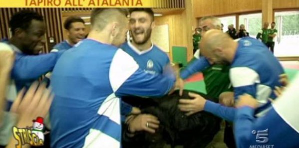 Simpatico il siparietto al momento della consegna a Zingonia, con lo storico tapiroforo Valerio Staffelli scherzosamente aggredito dai giocatori di Reja