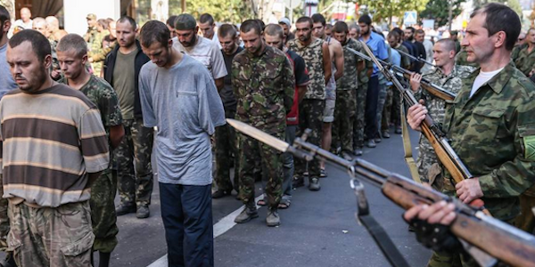 In risposta alla sfilata per celebrare l'indipendenza di Kiev, i separatisti filorussi hanno costretto i prigionieri a una camminata umiliante nel centro della repubblica autoproclamata di Donetsk