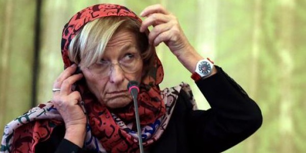 Appena scesa dall'aereo il ministro è stata attorniata dalle autorità iraniane: solo l'intervento del collega iraniano Zarif l'avrebbe convinta a seguire il protocollo e coprirsi il capo