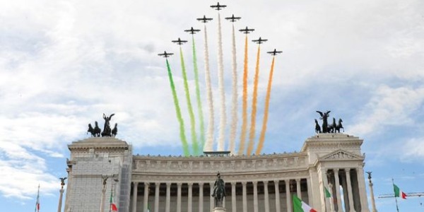 La tradizione prima di tutto: se al Quirinale si è deciso di tenere le porte chiuse, ai Fori Imperiali le bande delle Forza armate sfilano e suonano per la prima volta sotto gli occhi di Matteo Renzi. E il presidente della Repubblica fa della cerimonia all'altare della Patria il cuore di questa festa