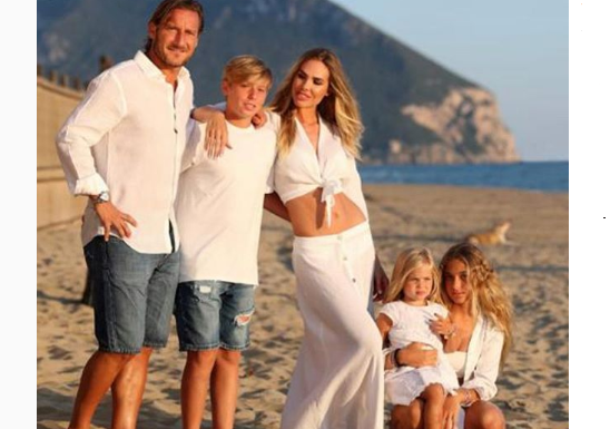 L’ex calciatore della Roma, la moglie Ilary Blasi e i tre figli posano per un ritratto di famiglia, che probabilmente farà parte della sitcom "Casa Totti"