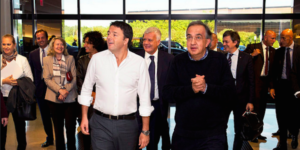 Tra il presidente del Consiglio e l'ad di Fca sembra esserci ormai una solida alleanza. Entrambi dicono di essere “contro i poteri forti”. Scivolone di Marchionne sullo stabilimento di Melfi